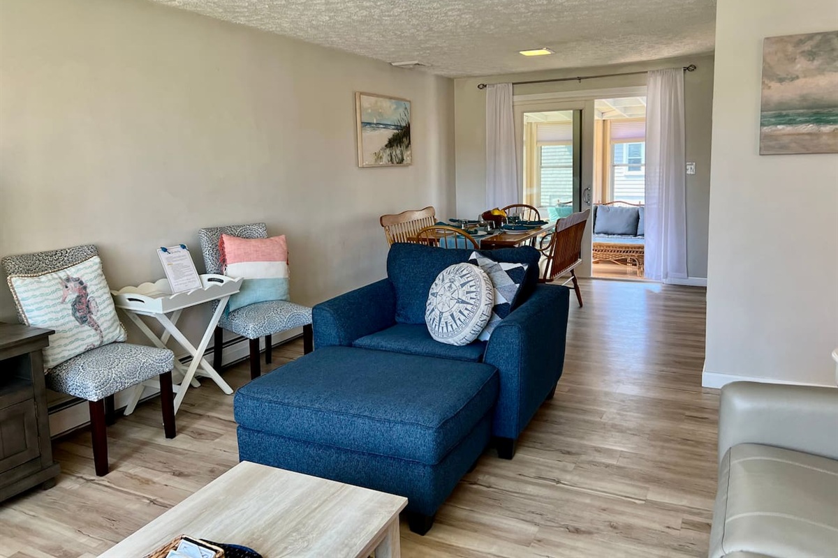 Arrive to the open concept living, kitchen and dining area with natural light to make you feel like you have truly arrived at your vacation. Off of the dining room, take advantage of the screened in sunporch with its ocean breeze and the smell of fresh salt air!