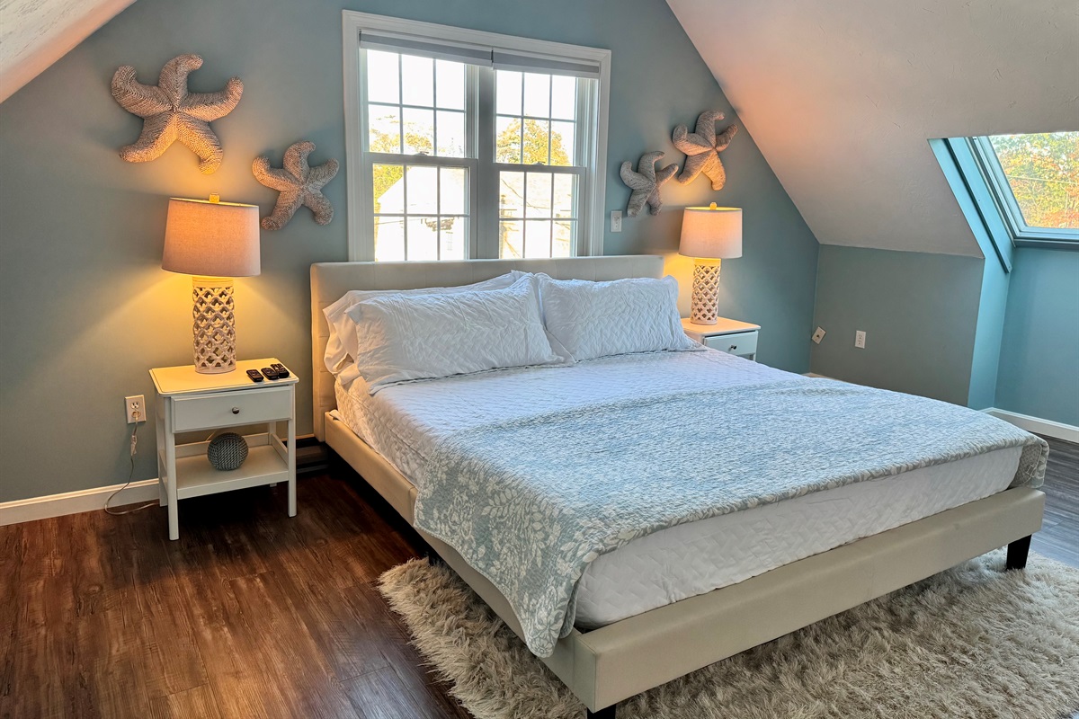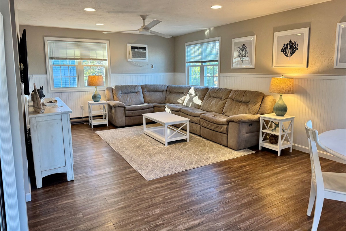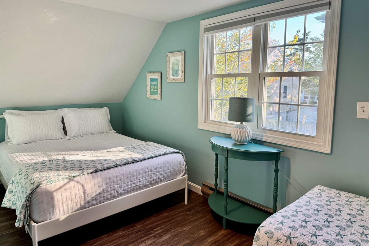 Inside, the open-concept kitchen and dining area makes every meal a moment to remember. Imagine fresh lobster dinners shared around the long dining table, the scent of butter and sea salt filling the air, followed by board games or late-night conversations in the cozy living room. The décor is simple and welcoming, designed for easy comfort after a day spent exploring Nubble Lighthouse, enjoying dinner at Fox’s Lobster House, or indulging in a cone from Dunne’s Ice Cream just up the road.
