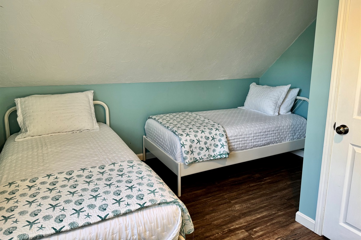 The first floor features a double twin bedroom and a junior king primary, both connected by a shared full bathroom. Upstairs, you’ll find a large primary bedroom and another guest room with a queen bed and two twin beds, perfect for families with children. These two rooms share a second full bathroom, offering plenty of space and privacy for everyone.
